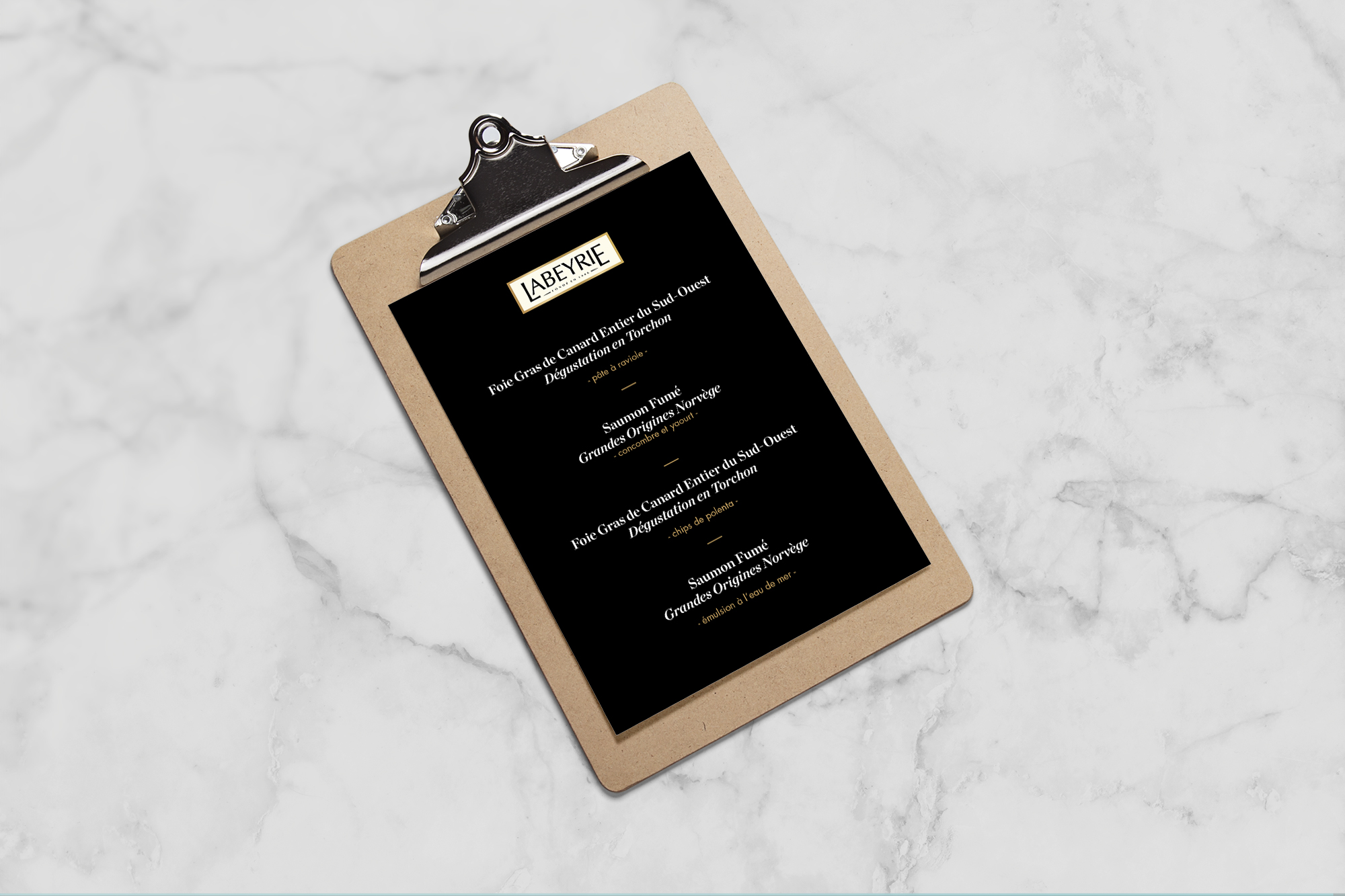 À l’occasion de l’événement presse Noël de la marque, un dossier de presse doit être mis à disposition des invités afin de présenter les nouvelles gammes de produits de celle-ci : le Saumon, le Foie Gras et la Pata Negra.
